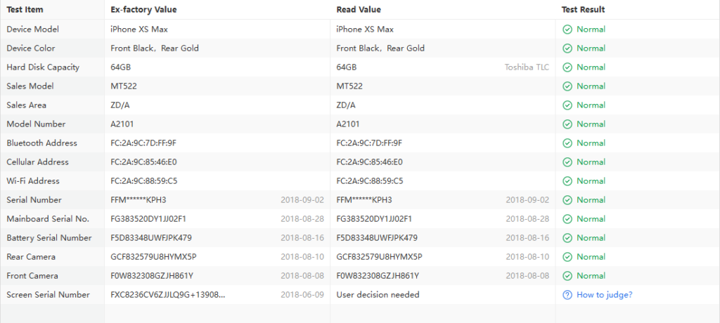 Hierboven tref je een voorbeeld van hoe ons verificatierapport er uit ziet. In het voorbeeld geeft het rapport alleen maar groene vinkjes aan. Dit houdt in dat het toestel in het verleden niet is gerepareerd. Let op: als er een onderdeeltje is vervangen is dit bij ons geen slecht teken. Wij vervangen bijvoorbeeld de batterij als deze niet aan onze kwaliteit voldoet.